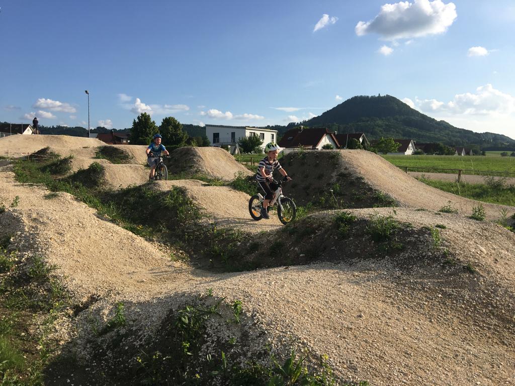 Dort bitte parken und dem Feldweg per Rad zum Fußballplatz folgen und auf dem Feldweg bleiben. Am Ende des Fußballplatzes links dem Schotterweg an der Parkbank folgen. Linker Hand ist dann der Pumptrack zu sehen.